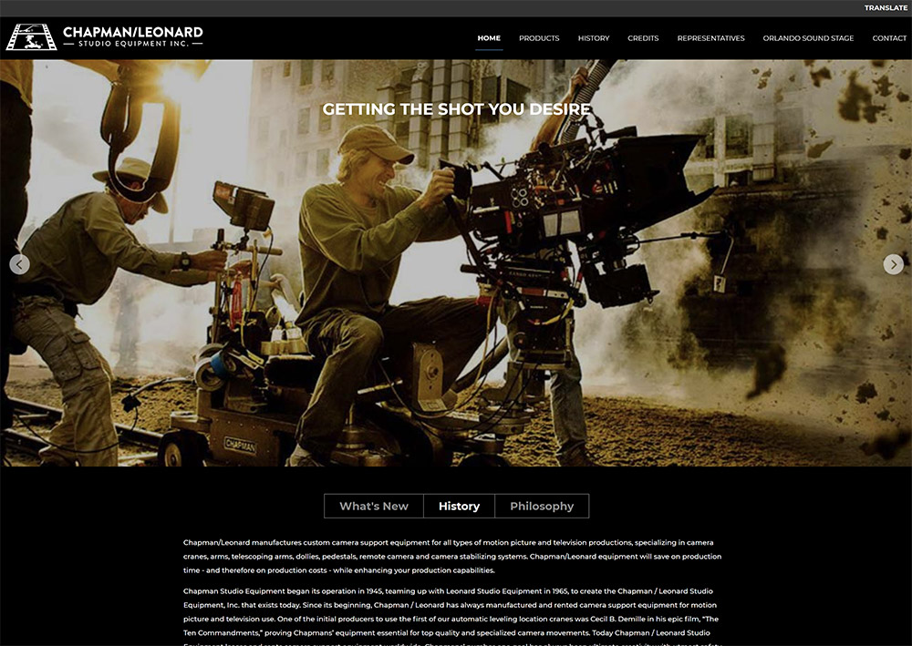 Chapman/Leonard manufactures custom camera support equipment for all types of motion picture and television productions, specializing in camera cranes, arms, telescoping arms, dollies, pedestals, remote camera and camera stabilizing systems.
